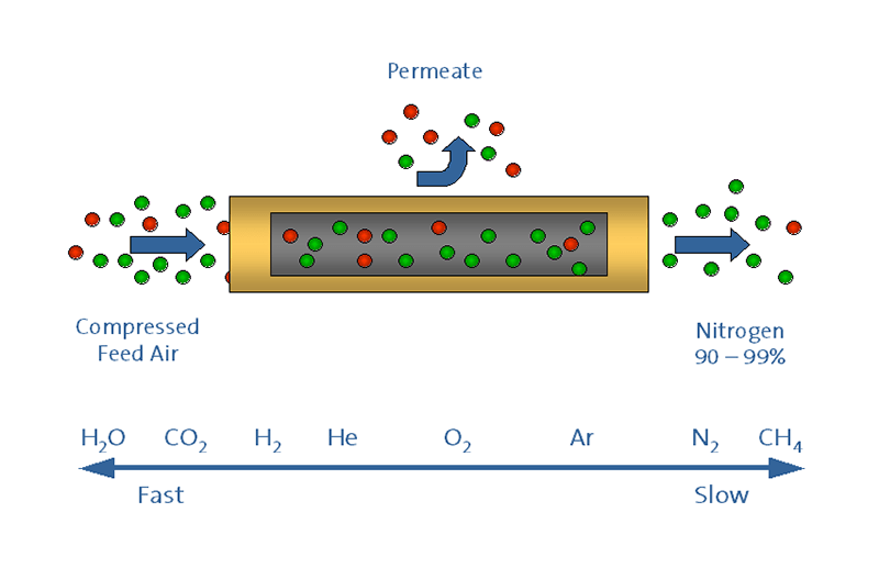 Air passes through the membrane through the fibers, releasing oxygen, water vapor, and other gases, except for nitrogen, which is trapped in the membrane.