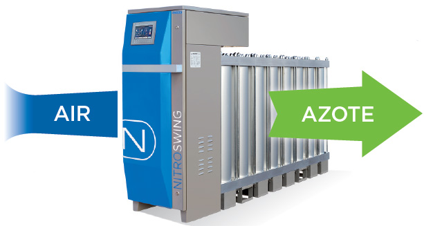 Генератор PSA (для адсорбции с колебанием давления, то есть разделения с переменным давлением) позволяет производить азот из окружающего воздуха. Это устройство состоит из двух резервуаров, заполненных молекулярным ситом (в данном случае активированным углем). Подача переменного давления в эти резервуары приводит к разделению различных присутствующих газов (азота, кислорода, аргона, благородных газов).